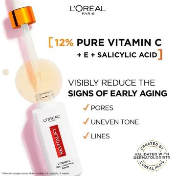 L'Oréal Paris Revitalift Clinical 12% Pure Vitamin C Serum är ett C-vitaminserum med lystergivande egenskaper. Serumet hjälper till att reducera fina linjer, motverka ojämn hudton samt synliga porer. Serumet innehåller 12% ren C-vitamin, E-vitamin och salicylsyra. 30 ml.