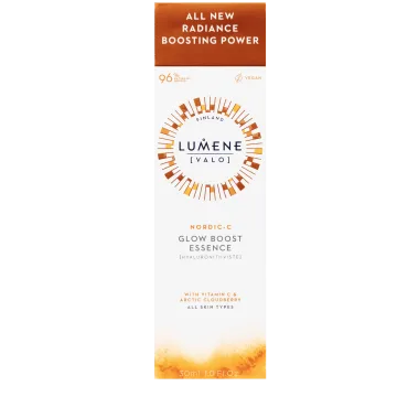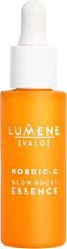 Lumene Nordic C Glow Boost Essence är ett återfuktande ansiktsserum med lystergivande och utjämnande egenskaper. Berikat med vitamin C från vilda nordiska hjortron som tillsammans med återfuktande hyaluronsyra bidrar till en jämnare och fylligare känsla i huden. Vegansk. 30 ml.