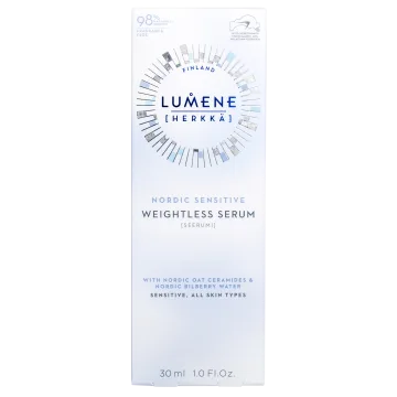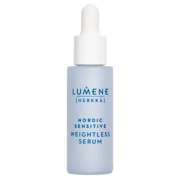 Lumene Nordic Sensitive Weightless Serum är ett återfuktande och lugnande serum som lindrar rodnad och känslan av stram, torr och irriterad hud. Serumet är berikat med återfuktande nordiskt blåbärsvatten i kombination med skyddande havreceramider och stärkande nordisk havrexylitol som hjälper till att skydda och stärka hudbarriären samt stödja mikrobiomet. Ett parfymfritt serum för känslig och torr hud. Vegansk. 30 ml.