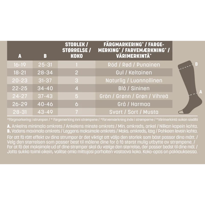 Mabs Care är en mjuk och bekväm stödstrumpa med öppen tå. Strumporna når upp till knät, är stickade i ett mjukt och bekvämt material med hög andel bomull och har kompressionsklass 1 (15–21 mmHg), som ger god komfort och ett bra stöd i vardagen. Den öppna tån gör det möjligt att inspektera foten under dagen och passar även vid problem med tårna. Du kan klippa av Mabs Care strumpan som har öppen tå, men inte de andra strumporna. Du klipper då strumpan i den övre delen för att passa längden av din vad. Vid långvarigt stillasittande eller stående kan benen och fötterna bli svullna och kännas tunga, spända och trötta. Även graviditet, övervikt och flygresor kan orsaka svullna fötter och ben. Genom att använda en kompressionsstrumpa ökar blodflödet i benen så att de känns pigga och starka hela dagen, oavsett du står går eller sitter mycket. Strumporna hjälper även till att motverka åderbråck. 1 par. Medicinteknisk produkt, läs bipacksedeln noga innan användning. Medicinska kompressionsstrumpor erbjuder kompressionsterapi med medicinsk kompression klass I som har en vetenskapligt bevisad effekt. Storleksguide: För att hitta rätt storlek mäts: 1) Omkrets runt ankeln där den är som smalast (A) 2) Omkrets runt vaden där den är som bredast (B) Storlek 1 (Röd): A 16–19 cm, B 25–31 cm, längd 31 cm Storlek 2 (Gul): A 18–21 cm, B 28–34 cm, längd 33 cm Storlek 3 (Vit): A 20–23 cm, B 31–37 cm, längd 35 cm Storlek 4 (Blå): A 22–25 cm, B 34–40 cm, längd 37 cm Storlek 5 (Grön): A 24–27 cm, B 37–43 cm, längd 39 cm Storlek 6 (Grå): A 26–29 cm, B 40–46 cm, längd 41 cm Storlek 7 (Svart): A 28–31 cm, B 43–49 cm, längd 43 cm Observera: Detta är en medicinteknisk produkt. Läs bipacksedeln före användning. Kompressionsstrumpor med klassad kompression har dokumenterad effekt och ska inte förväxlas med vanliga stödstrumpor. Mabs Care Cotton-strumpan har en markering som visar strumpans storlek i form av en färgad söm upptill på utsidan: 1 - Röd, 2 - Gul, 3 - Vit, 4 - Blå, 5 - Grön, 6 - Grå, 7 - Svart.
