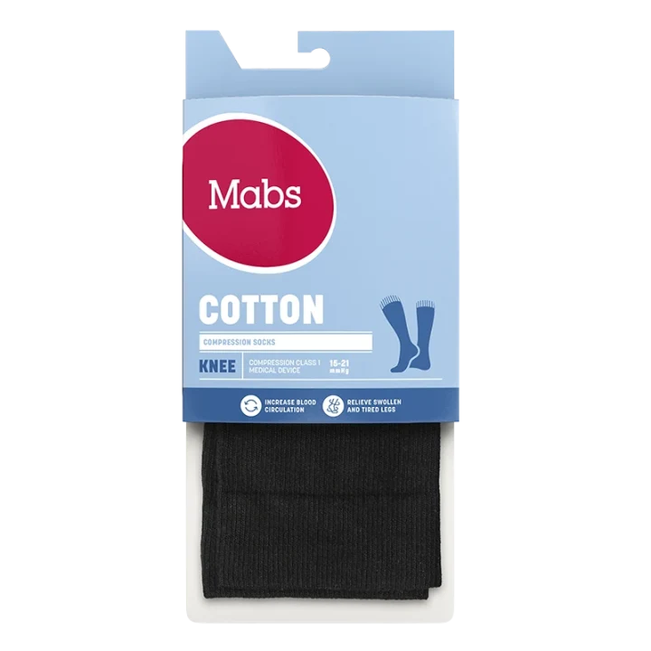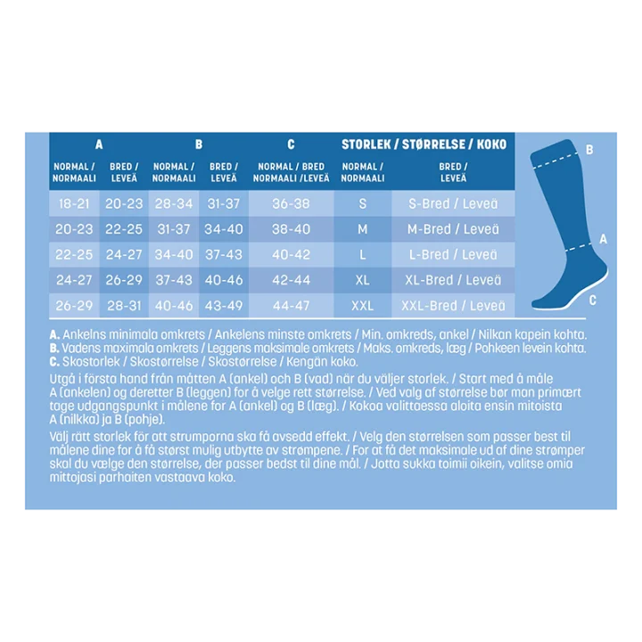 Mabs Cotton Knee Wide är en mjuk och skön kompressionsstrumpa med hög andel bomull och passar dig som har bredare vader och ger stöd i vardagen. Strumpan är stickad i ett bekvämt, hållbart OEKO-tex certifierat material och av kompressionsklass 1 (15-21 mmHg) samt har en graderad kompression som är högst vid ankeln och avtar sedan upp mot knät. Vid långvarigt stillasittande eller stående kan benen och fötterna bli svullna och kännas tunga, spända och trötta. Även graviditet, övervikt och flygresor kan orsaka svullna fötter och ben. Genom att använda en kompressionsstrumpa ökar blodflödet i benen så att de känns pigga och starka hela dagen, oavsett du står går eller sitter mycket. Strumporna hjälper även till att motverka åderbråck. 1 par. Medicinteknisk produkt, läs bipacksedeln noga innan användning. Medicinska kompressionsstrumpor erbjuder kompressionsterapi med medicinsk kompression klass I som har en vetenskapligt bevisad effekt. För att hitta din strumpstorlek och för att passformen ska bli perfekt finns det tre mått du bör utgå från: 1) Omkretsen runt ankeln där den är som smalast (A). 2) Omkretsen runt vaden där den är som bredast (B). 3) Din skostorlek (C). Storleksöversikt: Storlek S-Bred: Omfång ankel: 20-23 cm (A), Omfång vad: 31-37 cm(B), Skostorlek: 36-38 ( C), Strumpans längd: 33 cm Storlek M-Bred: Omfång ankel: 22-23 cm (A), Omfång vad: 34-40 cm(B), Skostorlek: 38-40 ( C), Strumpans längd: 35 cm Storlek L-Bred: Omfång ankel: 24-27 cm (A), Omfång vad: 37-43 cm(B), Skostorlek: 40-42( C) Strumpans längd: 37 cm Storlek XL-Bred: Omfång ankel: 26-29 cm (A), Omfång vad: 40-46 cm(B), Skostorlek: 43-44( C), Strumpans längd: 39 cm Storlek XXL-Bred: Omfång ankel: 28-31 cm (A), Omfång vad: 43-49 cm(B), Skostorlek: 44-47( C), Strumpans längd: 41 cm
