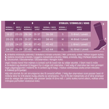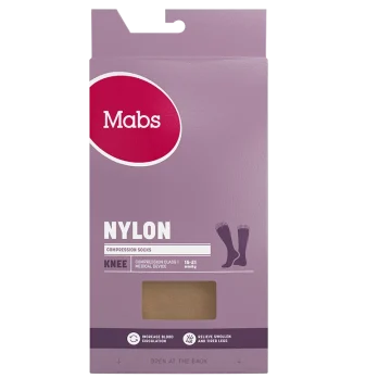 Mabs Nylon Knee är en tunn och elegant kompressionsstrumpa som ger bra stöd i vardagen. Strumpan har graderad kompression vilket ökar blodflödet i benen något som i sin tur motverkar trötthet, svullnad och åderbråck. Strumpan är stickad i ett bekvämt, hållbart OEKO-texcertifierat material och av kompressionsklass 1 (15-21 mmHg), 140 denier. Har en mjuk resårkant som minskar risken för stasning. Vid långvarigt stillasittande eller stående kan benen och fötterna bli svullna och kännas tunga, spända och trötta. Även graviditet, övervikt och flygresor kan orsaka svullna fötter och ben. Genom att använda en kompressionsstrumpa ökar blodflödet i benen så att de känns pigga och starka hela dagen, oavsett du står går eller sitter mycket. Strumporna hjälper även till att motverka åderbråck. 1 par. Medicinteknisk produkt, läs bipacksedeln noga innan användning. Medicinska kompressionsstrumpor erbjuder kompressionsterapi med medicinsk kompression klass I som har en vetenskapligt bevisad effekt. För att hitta din strumpstorlek och för att passformen ska bli perfekt finns det tre mått du bör utgå från: 1) Omkretsen runt ankeln där den är som smalast (A). 2) Omkretsen runt vaden där den är som bredast (B). 3) Din skostorlek (C). Storleksöversikt: Storlek S: Omfång ankel: 18-21 cm (A), Omfång vad: 28-34 cm (B), Skostorlek: 36-38 ( C), Strumpans längd: 32 cm Storlek M: Omfång ankel: 20-23 cm (A), Omfång vad: 31-37 cm (B), Skostorlek: 38-40 ( C), Strumpans längd: 34 cm Storlek L: Omfång ankel: 22-25 cm (A), Omfång vad: 34-40 cm (B), Skostorlek: 40-42( C) Strumpans längd: 36 cm Storlek XL : Omfång ankel: 24-27 cm (A), Omfång vad: 37-43 cm (B), Skostorlek: 42-44( C), Strumpans längd: 38 cm