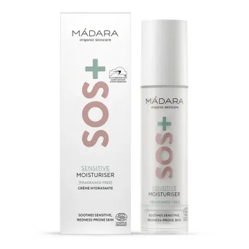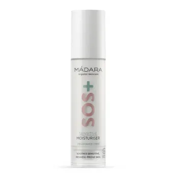 Mádara SOS+ Sensitive Moisturiser är en återfuktande hudkräm som skonsamt lugnar känslig hud som lätt blir röd och irriterad. Berikad med hyaluronsyra som ger och binder fukt i huden. Innehåller rödalger som har egenskaper som kan hjälpa att balansera hudens mikrobiom och förstärker hudens naturliga skydd. Innehåller inte färgämnen. Passar alla hudtyper. Oparfymerad. Vegansk. 50ml.