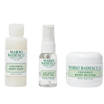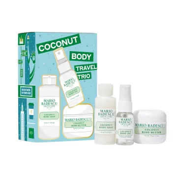 Mario Badescu Coconut Body Travel Trio är en presentförpackning med komplett kroppsvård i resestorlek med doft av kokos. Presentförpackningen innehåller Coconut Body Soap, en uppfriskande duschtvål med ett krämigt lödder som rengör och återfuktar huden. 59 ml. Coconut Body Oil en återfuktande torrolja som ger lyster till huden. 20 ml. och Coconut Body Butter, en lyxig och rik body butter som smälter in i huden och bidrar till en mjuk hud. 56 g.