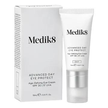 Medik8 Advanced Day Eye Protect SPF 30 är en lätt ögonkräm för användning under dagtid. Ögonkrämen har SPF30 och skyddar mot solens skadliga strålar. Innehåller extrakt från moringa oleifera, L-karnosin och extrakt från kakaoböna. L-karnosin är ett aktivt ämne som motverkar glykosylering, hjälper till att stimulera kollagensyntesen och skydda mot skador från infraröd strålning. Kakaobönaextrakt skyddar huden från skadligt blått ljus samtidigt som det motverkar skadliga fria radikaler och främjar kollagenproduktionen. Vegansk. 15ml.