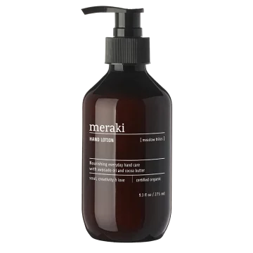 Meraki Hand Lotion Meadow Bliss är en ekologisk handkräm berikad med aloe vera, trehalos och glycerin som tillför fukt och förhindrar att huden torkar ut. Ekologisk avokadoolja är rik på antioxidanten E-vitamin och återfuktar, ger näring och mjukar upp din hud. Den har en god doft av bitter citrus, trä, verbena och te. 275 ml.