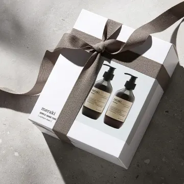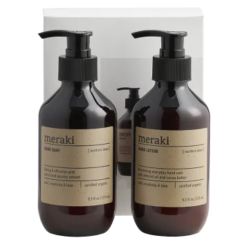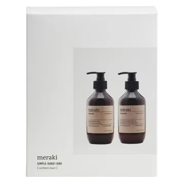 Meraki Presentask Northern Dawn Simple Hand Care Vit är en presentförpackning från Meraki som innehåller en handtvål och en handkräm med doft av apelsin, cederträ och sweet balsamic. Tvålen innehåller extrakt från morot och persilja, handkrämen innehåller även mandelolja och kakaosmör som vårdar dina händer. 2 x 275 ml.