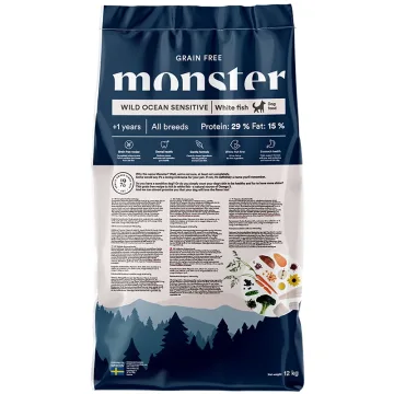Monster Dog Grain Free Wild Ocean Sensitive är ett spannmålsfritt torrfoder för känslig hund. Hundfoder med fisk som enda proteinkälla för att minska uppkomsten av känsligheter. Innehåller vit fisk som är naturligt rik på omega 3, kombinerat med havre som skonsam glutenfri kolhydratkälla. Innehåller också mineralen natriumhexametafosfat för att minska tandstensbildning. Passar från 1 år och uppåt.
