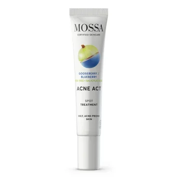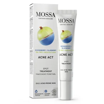 Mossa Acne Act Spot Treatment är ett kraftfullt koncentrat som hjälper till att lindra inflammation och rodnad, och hjälper till att minimera uppkomsten av pormaskar och blemmor. Formulan innehåller salicylsyra som ger antibakteriella fördelar, och extrakt från krusbär och blåbär bidrar med viktiga vitaminer och antioxidanter, vilket stöttar hudens förnyelseprocess. 10 ml.