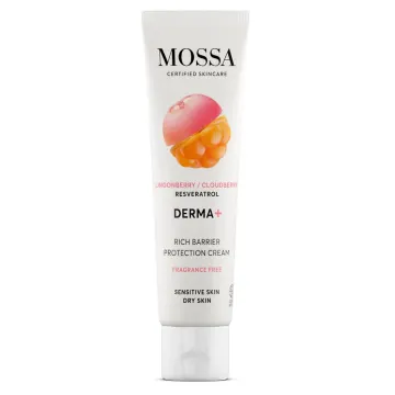 Mossa Derma+ Rich Barrier Protecting Cream är en skyddande ansiktskräm som hjälper till att stärka hudens naturliga skyddsbarriär. Berikad med sheasmör och kakaosmör som ger långvarig återfuktning, vegetabiliska oljor som jojobaolja, solrosolja och olivolja, samt extrakt från lingon och hjortron som är rika på antioxidanter och vitaminer. Vegansk och certifierad enligt Ecocert Cosmos Natural. Passar normal till torr och känslig hy. 60 ml.