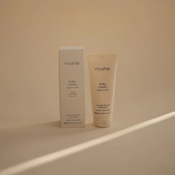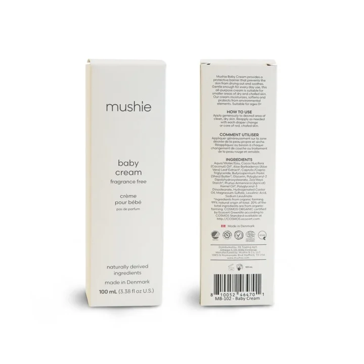 Mushie Baby Cream är en ekologisk hudkräm för bebisar och små barn. Berikad med milda återfuktande och lugnande ingredienser som kokosolja, sheasmör, glycerin och aprikosolja som vårdar bebisens känslig hud. Krämen har en fyllig konsistens som bildar en skyddande barriär på huden och förhindrar att den torkar ut. Skonsam formula som kan användas varje dag och passar alla hudområden med torr eller irriterad hud. Krämen innehåller 99% naturliga ingredienser och kan användas på bebisar från 0 månaders ålder. Tillverkad i Danmark. Oparfymerad. 100 ml.