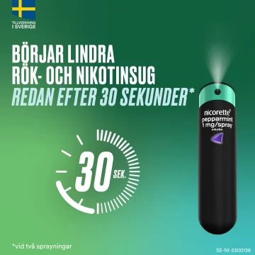 Munspray med nikotin. Snabb lindring - börjar minska röksuget efter bara 30 sekunder (vid 2 sprayningar). Kliniskt bevisad att lindra röksuget. Med smak av röda frukter och mint. Sockerfri. Receptfritt nikotinläkemedel som minskar röksug och lindrar abstinensbesvär. Kombinationsbehandling: kan kombineras med Nicorette® Novum depotplåster.