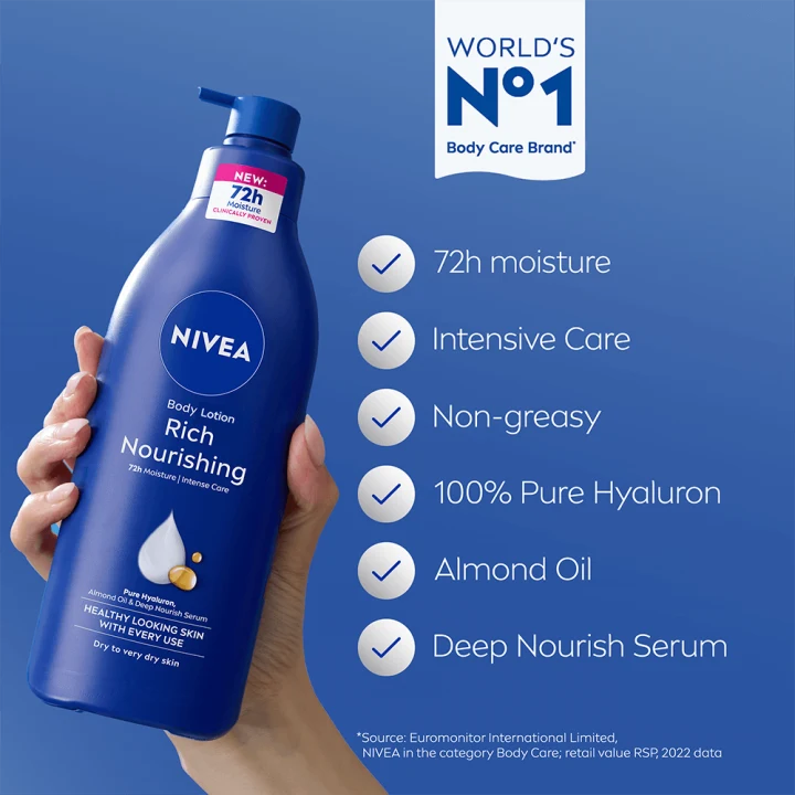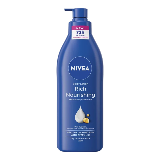 Nivea Body Essentials Caring Milk Pump är djupt återfuktande kroppslotion. Berikad med naturlig mandelolja, vitamin E och Deep Moisture Serum. Vårdande formula med flera egenskaper som ger djup återfuktning, skyddar mot uttorkning och ger en mjuk hudkänsla utan att kladda för en hälsosam hud. Dermatologiskt testad. 400 ml.