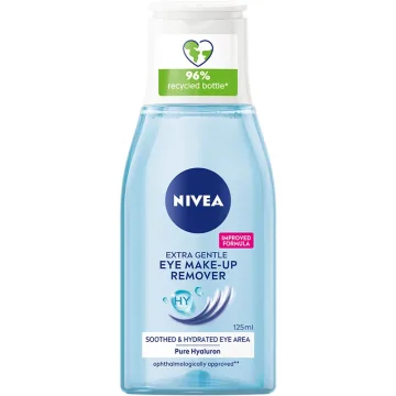 Nivea Daily Essentials Gentle Eye make-up Remover är sminkborttagning för ögonen, berikad med Vitamin B5. Avlägsnar effektivt vattenlöslig mascara och återfuktar det känsliga området runt ögonen samtidigt som den är skonsam för ögonfransarna. Efterlämnar inga obehagliga feta rester. Skonsam för ögonfransarna. Dermatologiskt testad. Passar alla hudtyper. Milt parfymerad. 125 ml.
