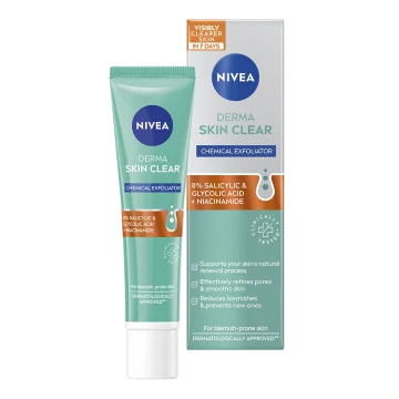 Nivea Derma Skin Clear Night Exfoliator är en kemisk peeling speciellt framtagen för oren hud. Exfolierande ansiktspeeling som hjälper till att minska blemmor och förhindra att de återkommer samtidigt som den stödjer hudens förnyelseprocess. Vegansk formula och innehåller 8% AHA/BHA samt niacinamid. Passar för fet hud. 40 ml.