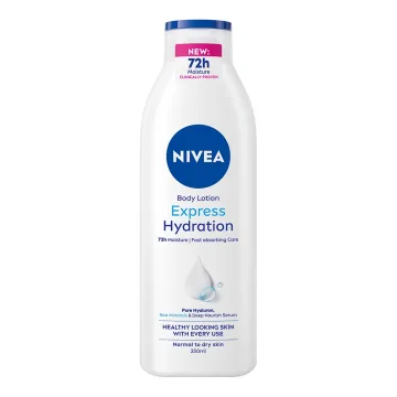Nivea Express Hydration Body Lotion är en återfuktande kroppslotion för torr hud. Berikad med hyaluronsyra, havsmineraler och Niveas djupt återfuktande serum som ger en lätt och snabbabsorberande formula som återfuktar huden i upp till 72 timmar. Innehåller även druvkärneolja som är naturligt rikt på antioxidanter. Milt parfymerad och passar normal till torr hud. 250 ml.