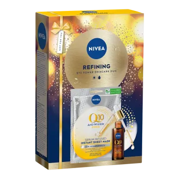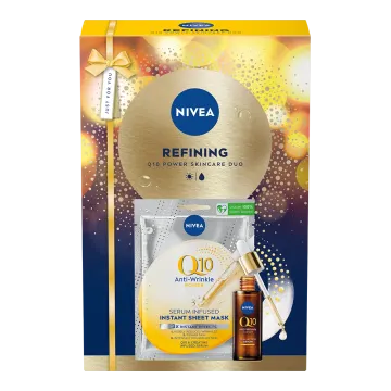 Nivea Giftpack Refining är en presentbox med hudvårdsprodukter som motverkar ålderstecken. Den innehåller Nivea Q10 Anti-Wrinkle Expert Dual Action Serum som återfuktar huden på djupet vilket bidrar till en smidigare hud samt Nivea Q10 Anti-Wrinkle Power Sheet Mask en mjukgörande sheet mask med kreatin som stimulerar hudens kollagenproduktion och ger en uppstramande effekt.