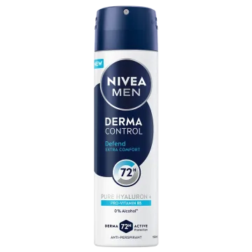 Nivea Men Deo Spray Derma Control Defend är en antiperspirant i sprayformat som erbjuder ett pålitligt 72-timmars skydd mot svett och lukt. Berikad med Ren Hyaluron och Pro-Vitamin B5 som skyddar huden mot klåda och vårdar huden. 150 ml.