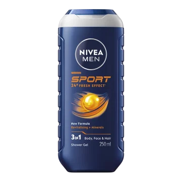 Nivea Men Sport Shower Gel är en uppfriskande duschgel för män. Effektiv formula berikad med mineraler som rengör och avlägsnar rester från smuts och svett. Passar perfekt att använda efter sportaktiviteter eller träning och kan användas på kroppen, i ansiktet och i håret. Duschgelen har en fräsch doft och ger en långvarigt uppfriskad och återfuktad känsla. Dermatologiskt testad och passar alla hudtyper. 250 ml.