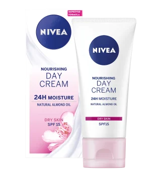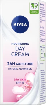 Nivea Nourishing Day Care SPF15 är en återfuktande dagkräm anpassad för torr hud. Ansiktskrämen återfuktar huden och hjälper till att balansera dess egen fuktnivå. Innehåller Nivea Moisture Care complex, naturlig mandelolja, sheasmör och antioxidanter. Hudkrämen återfuktar huden på djupet och gör den mjuk. Med SPF 15 som skyddar mot hudskador orsakade av solen. 50 ml.