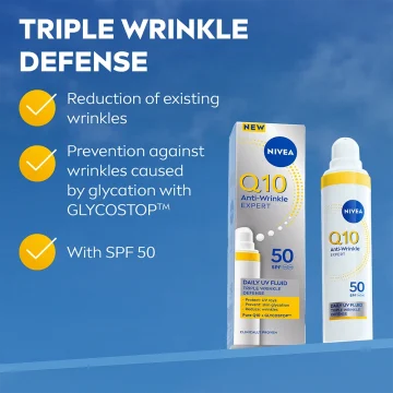 Nivea Q10 Anti-Wrinkle Expert Daily UV Fluid SPF50 är en dagkräm som skyddar mot UV-strålar och förhindrar glykeringsprocesser i huden och minimerar rynkor. Berikad med Q10, GLYCOSTOP och bredspektrum UV-filter för trippelt skydd mot rynkor. Dagkrämen skyddar mot både UVA- och UVB-strålar och har en formula som lämnar huden glansfri i 12 timmar. Passar alla hudtyper, även kombinerad och känslig hud. 40 ml.