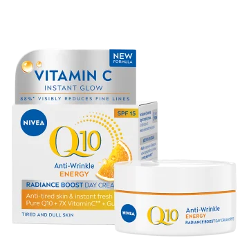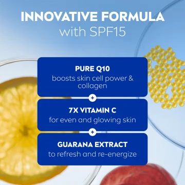 Nivea Q10 Energy Day Cream är en lystergivande och återfuktande dagkräm med SPF 15. Berikad med kraftfulla antioxidanter från C-vitamin, E-vitamin och Q10 som tillsammans med återfuktande glycerin piggar upp, ger lyster och ger långvarig återfuktning. Solskyddsfaktor 15 skyddar huden från solens skadliga UVA- och UVB-strålar. Dermatologiskt testad och passar alla hudtyper. 50 ml.