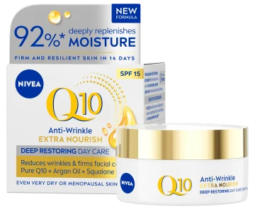 Nivea Q10 Extra Nourish Day Cream är en dagkräm med anti age-effekt och SPF 15. Berikad med hudidentiskt Q10, ekologisk arganolja, glycerin och E-vitamin som återfuktar och vårdar huden samtidigt som intrycket av rynkor och fina linjer reduceras. Solskyddsfaktor 15 skyddar huden mot solens skadliga UVA- och UVB-strålar som orsakar för tidigt åldrande. Fyllig formula som ger långvarig återfuktning och är speciellt anpassad för torr hud. 50 ml.
