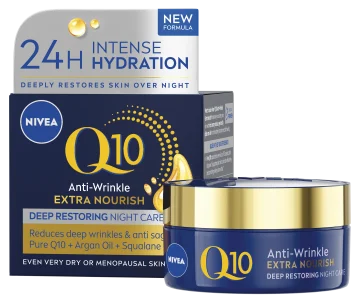 Nivea Q10 Extra Nourish Night Cream är en nattkräm med anti age-effekt speciellt framtagen för torr hud. Berikad med hudidentiskt Q10, ekologisk arganolja, glycerin och pantenol som återfuktar och vårdar huden under natten, samtidigt som intrycket av rynkor och fina linjer reduceras. Fyllig formula som ger långvarig återfuktning och är speciellt anpassad för torr hud. 50 ml.