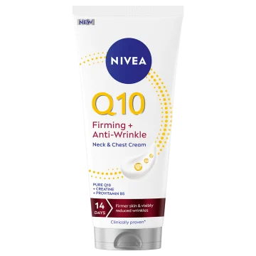 Nivea Q10 Firming+ Anti-wrinkle Neck & Chest Cream är en återfuktande kräm framtagen för nacke och dekolletage som reducerar rynkor och fina linjer. Berikad med ren Q10, Kreatin och Provitamin B5 som mjukgör huden och bidrar till en fastare hud vid regelbunden användning. 200 ml.