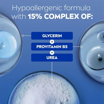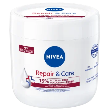 Nivea Repair & Care Urea Body Cream är en vårdande hudkräm för torr och stram hud. Krämen reparerar synliga tecken på torrhet och gör att huden känns mjuk och smidig direkt efter applicering. Berikad med 15% glycerin och urea som vårdar huden, hjälper till att bibehålla fukt och ger en återfuktad och mjuk känsla i upp till 72 timmar. Kan användas på kroppen, händerna och i ansiktet. Dermatologiskt testad. 400 ml.