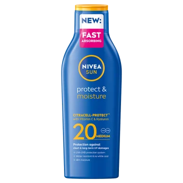 Nivea Sun Protect & Moisture Lotion SPF20 är en återfuktande solkräm med medelhögt solskydd som ger omedelbart skydd mot UVA- och UVB-strålar, solbränna och för tidigt åldrande av huden. Den vattenresistenta formulan med vitamin E återfuktar huden i 48 timmar och fungerar i harmoni med hudens mikrobiom, ett naturligt lager av bakterier som fungerar som hudens försvarssystem. Den vårdande formulan är 84% biologiskt nedbrytbar. Produktförpackningen är tillverkad av 50% återvunnen flaska och lock (exklusive etikett). Detta solskydd är dermatologiskt testad. NIVEA SUN ger din hud all den vård den behöver. Genom att kombinera effektiva UV-skydd med avancerade aktiva ingredienser, skyddas din hud mot solens strålar samtidigt som de återfuktande och vårdande ingredienserna verkar under hela dagen. SPF 20. 200 ml.