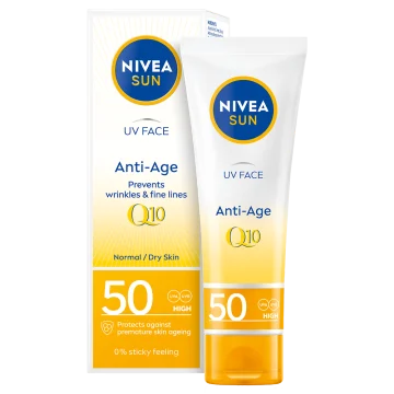 Nivea Sun UV Face Anti Age Q10 Cream SPF 50 är en solkräm för ansiktet med högt solskydd. Krämen har en lätt och kladdfri formula som är speciellt utvecklad för den känsliga huden i ansiktet. Berikad med Q10 och antioxidanter som hjälper till att förebygga och motverka ålderstecken som orsakas av solen. Oftalmologiskt och dermatologiskt testad. Passar normal till torr hy. 50 ml.