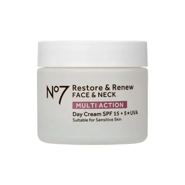 No7 Restore & Renew Multi Action Day Cream SPF15 är en vårdande, fuktbevarande dagkräm som kan bidra till att släta ut huden. Berikad med hyaluronsyra, pro-retinol och Advanced Fortifying complex som består av kalcium, aminosyror och ceramider. Innehåller Matrixyl 3000 Plus som är en antirynk-teknologi och består av peptider och kollagen som kan hjälpa till att reducera rynkor och fina linjer. Ger en mjuk och smidig hy med fastare känsla och passar särskilt bra för mogen hud som förlorat sin spänst. SPF15 och UVA-skydd skyddar huden mot åldrande orsakat av solens strålar. Passar alla hudtyper. 50 ml.
