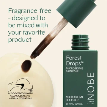 NOBE Forest Drops® Microbiome Booster är näringsgivande droppar för huden. Forest Drops® är berikade med mikrobiotiskt skogsextrakt och motsvarar skogens rika och varierade mångfald som har visat sig kunna bidra till att återställa den naturliga balansen i hudens mikrobiom, hudens egna ekosystem. De mörkbruna dropparna består av mikrobiella partiklar som aktiveras vid applicering och färgen försvinner när man blandar dem med fuktighetskräm, serum, handkräm, kroppslotion eller fotkräm. Forest Drops® är certifierad enligt Ecocert COSMOS Natural och 99,34 % av ingredienserna har naturligt ursprung. Produkten har även tilldelats Allergy Label från finska Allergi-, hud- och astmaförbundet. Passar alla hudtyper. 30 ml. Forest Drops® är utvecklat och patenterat av det finska företaget Uute Scientific.