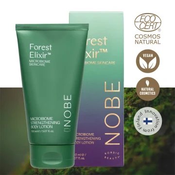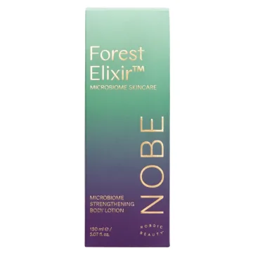 NOBE Forest Elixir® Microbiome Strengthening Body Lotion är en mjukgörande kroppslotion som får huden att kännas mjuk och len. Forest Elixir® är berikat med mikrobiotiskt skogsextrakt som motsvarar skogens rika och varierade mångfald och har visat sig kunna bidra till att återställa den naturliga balansen i hudens mikrobiom, hudens eget ekosystem. Krämen innehåller även näringsgivande sheasmör och en doft av skog. Passar alla hudtyper. Certifierad enligt Ecocert COSMOS Natural och 99,34 % av ingredienserna har naturligt ursprung. 150 ml. Forest Elixir® är utvecklat och patenterat av det finska företaget Uute Scientific.