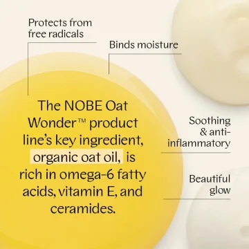 NOBE Oat Wonder® Nourishing Face Oil är en näringsgivande ansiktsolja med mild doft av vanilj. Berikad med ekologisk havreolja från Fazer Oat Oil rik på fettsyror, E-vitamin och ceramider som bidrar med näring samtidigt som det skyddar huden mot fria radikaler. Havreolja har även egenskaper som kan hjälpa till att lugna irriterad hud samt bevara fukt. Ansiktsoljan innehåller även squalene och en antioxidantrik olja från druvkärnor som har egenskaper som är mjukgörande för huden. Formulan absorberas snabbt och gör att huden får en naturlig lyster. Passar alla hudtyper. 99,8% av ingredienserna har naturligt ursprung. 30 ml.