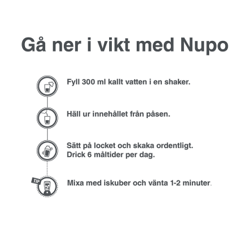 Tillsätt 300 ml kallt vatten och 1 påse Nupo i en shaker. Skaka ordentligt och njut av alla 6 portioner per dag. Det är viktigt att följa bruksanvisningen.