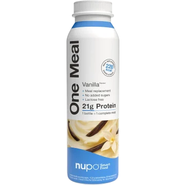 Nupo One Meal RTD Vanilla Laktosfri är en måltidsersättning för viktkontroll med vaniljsmak. Näringsrik måltidsersättning med få kalorier som innehåller lättmjölk och är proteinberikad, med vegetabilisk olja, vitaminer och mineraler. Innehåller sötningsmedel. Laktosfri. UHT-behandlad. 330 ml.