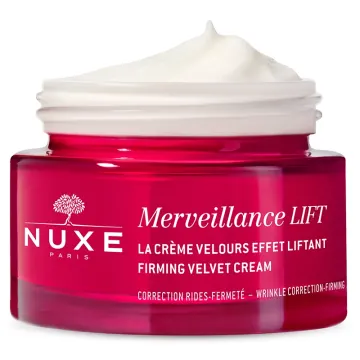 Nuxe Merveillance LIFT Firming Velvet Cream är en dagkräm med anti age-egenskaper. Med en sammetslen formula som ger en uppstramande och utjämnande effekt, som bidrar till att minska synbarheten av rynkor och fina linjer. Berikad med mikroalgolja som stäker huden inifrån och kan hjälpa till att korrigera åldersrelaterade ojämnheter. Med en lätt, blommig doft med inslag av vit mysk, magnolia och freesia. Passar normal till torr hy. Innehåller 97% ingredienser av naturligt ursprung. Vegansk. 50 ml.