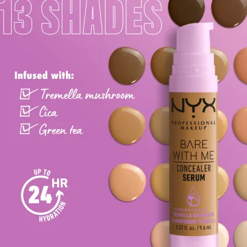 NYX Professional Makeup Bare With Me Concealer Serum är en mediumtäckande concealer som kombinerar makeup och hudvård. Täcker effektivt mörka ringar under ögonen, blemmor, rodnad och ojämnheter utan att kännas torr eller kakig. Berikad med bland annat glycerin, grönt te, cica-extrakt, E-vitamin och allantoin som återfuktar huden i upp till 24 timmar och ger en lugnande känsla. Lätt formula som är enkel att applicera och tona ut på huden. Ger en osynlig finish och passar perfekt för en osminkad look. En pumpning räcker för att ge ett naturligt resultat med jämn täckning. Kan användas både i ansiktet och på kroppen. Kan användas av alla hudtyper, men passar extra bra för torr och känslig hy. Vegansk. 9,6 ml.