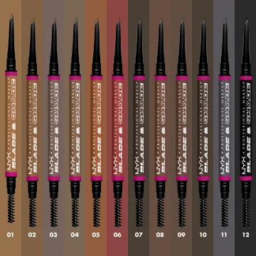 NYX Professional Makeup Blade & Shade är en ögonbrynspenna som ger ett salongsliknande resultat när du fyller i ögonbrynen hemma. Pennan har en unikt utformad spets som både har en ultratunn sida som används för att skapa hårstråliknande streck och forma ögonbrynen till önskad längd och bredd, och en bred sida som används för att skugga ögonbrynen och ge dem ett fylligare intryck. Resultatet håller i upp till 16 timmar utan att blekna eller smetas ut under dagen. Krämiga pigment som glider lätt över huden utan att fastna. Finns i 12 nyanser. 0,1 g.