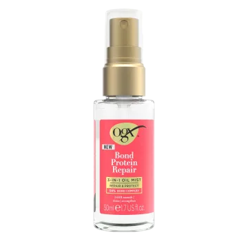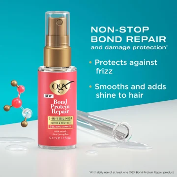 OGX Bond Repair 3-in-1 Oil Mist är en vårdande oljemist som stärker och skyddar skadat hår. Den motverkar friss och ger en silkeslen finish samtidigt som den bevarar glansen i upp till 24 timmar. Lätt och viktlös formula som inte tynger ner håret, går att använda på både fuktigt och torrt hår. 50 ml.