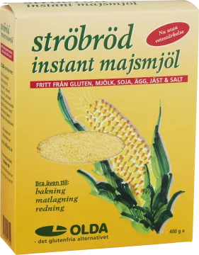 Olda Ströbröd Instant Majsmjöl är ett glutenfritt ströbrod tllverkat av majsgryn. Ströbrödet är helt fritt från gluten, mjölk, soja, ägg, jäst och salt, och passar perfekt till matlagning och bakning vid allergier och kostrestriktioner. Kan användas för att exempelvis panera kött, fisk och grönsaker, eller för att baka både mjuka och hårda kakor samt fröknäcke. Kan även användas i varm och kall gröt, för att reda varma och kalla såser eller tillsättas i bröddeg och annan bakning. 400 g.