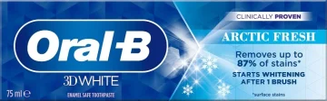 Oral-B 3D White Arctic Fresh Tandkräm är en kliniskt bevisad tandkräm som hjälper till att göra tänderna vitare. Kan ta bort upp till 87% procent av ytliga missfärgningar på tänderna. Uppfriskande mintsmak som ger en fräsch känsla. 75 ml.