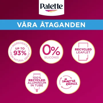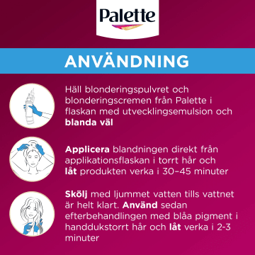 Palette Intensive Creme Coloration är en permanent hårslingsbehandling som ger intensiva slingor. Behandlingen hjälper till att ge ett hållbart resultat med blonda nyanser. Slingblonderingen tillför uppljusande ämnen i håret för och bleker upp till 7 nivåer. Den medföljande efterbehandlingen med blåa pigment hjälper till att neutralisera gula toner. Efteråt känns håret mer lättkammat, återfuktat och lent. Innehåller 60 ml utvecklingsemulsion/20 g Blonderingspulver/15 ml Care Conditioner