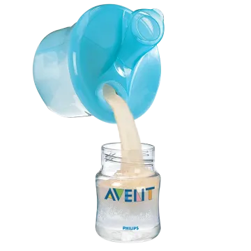 Philips Avent Behållare för Mjölkpulver är en behållare som rymmer tre uppmätta portioner av mjölkpulver i separata fack. När det är dags för matning öppnar du pipen och häller över pulvret till valfri nappflaska. Insatsen i förvaringen kan lyftas ur och behållaren kan då användas som skål eller mugg. Rymmer pulver till tre måltider á 260 ml. Kan värmas i mikrovågsugn och diskas i diskmaskin.