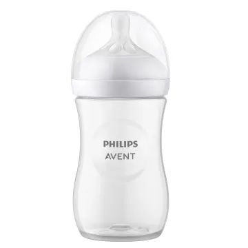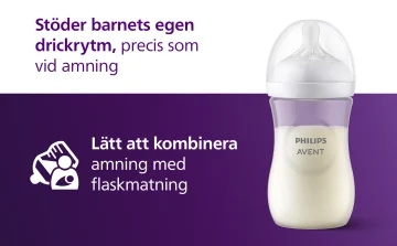 Philips Avent Natural Response Nappflaska är försedd med en dinapp som frigör mjölk endast när bebisen aktivt dricker. Barnet kan dricka, svälja och andas med sin naturliga rytm, precis som vid amning. Det gör att det blir enkelt att kombinera amning och flaskmatning. Den breda, mjuka och flexibla dinappen i mjukt silikon är utformad för att se ut och kännas som ett bröst, vilket underlättar för bebisen att få ett bra tag och börja dricka. Ventilen är utformad på ett sätt som håller luften från bebisens mage borta, något som minskar risken för kolik. Nattöppningen är utformad för att endast frigöra mjölk när bebisen äter. Nappflaskan har en bred flaskhals som gör att flaskan är enkel att fylla på och rengöra. Den består av få delar, vilket gör att den går enkelt och snabbt att sätta ihop. Flaskan är utformad på ett ergonomiskt sätt och är lätt att greppa i alla vinklar. I förpackningen ingår en 260 ml-nappflaska och en dinapp med flöde 3. Passar barn från 1 månad och uppåt. 260 ml.