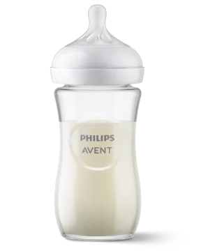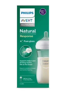 Philips Avent Natural Response Nappflaska Glas är en glasflaska tillverkad i värmebeständigt glas, speciellt framtagen för att det ska vara enkelt att kombinera amning och flaskmatning. Dinappen är utformad för att efterlikna ett bröst och simulerar amning genom att frigöra mjölk när bebisen suger aktivt. Bebisen kan då dricka, svälja och andas i sin egen rytm, precis som vid amning. Flaskan har en inbyggd antikolik-funktion som hjälper till att förhindra att barnet sväljer luft under matningen. Enkel att montera och lätt att rengöra tack vare en bred öppning. Rymmer 240 ml.