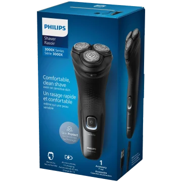 Philips 3000X Series Shaver är en rakapparat med 27 självslipande blad som ger ett jämnt resultat och kan användas vid både torrakning och våtrakning. De flexibla 4D-huvudena följer ansiktets konturer och ger en nära och hudvänlig rakning. Med ett ergonomiskt handtag som ger ett bekvämt grepp och en pop-up-trimmer för smidig trimning av mustasch och polisonger. En fulladdning ger ca. 45 minuters rakning. Vattentät och lätt att rengöra, kan även användas i duschen.