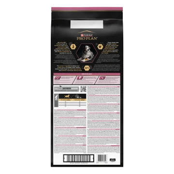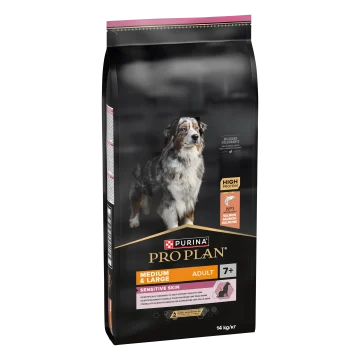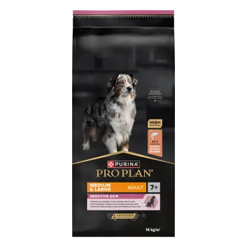PURINA PRO PLAN Medium & Large Adult 7+ Sensitive Skin Torrfoder Hund är ett komplett torrfoder för hundar som hjälper till att främja frisk hud och blank päls. Torrfodret är vetenskapligt sammansatt för medelstora och stora äldre hundar med känslig hud. Fodret innehåller bitar av högkvalitativ lax som huvudingrediens och är noggrant sammansatt med utvalda proteinkällor och utan vete. Receptet innehåller också ingredienser som bidrar till friska leder och en aktiv livsstil för äldre hundar. Sammansättningen innehåller en kombination av hudvårdande näringsämnen som aminosyror, essentiella fettsyror, B-vitamin och zink. 14kg.
